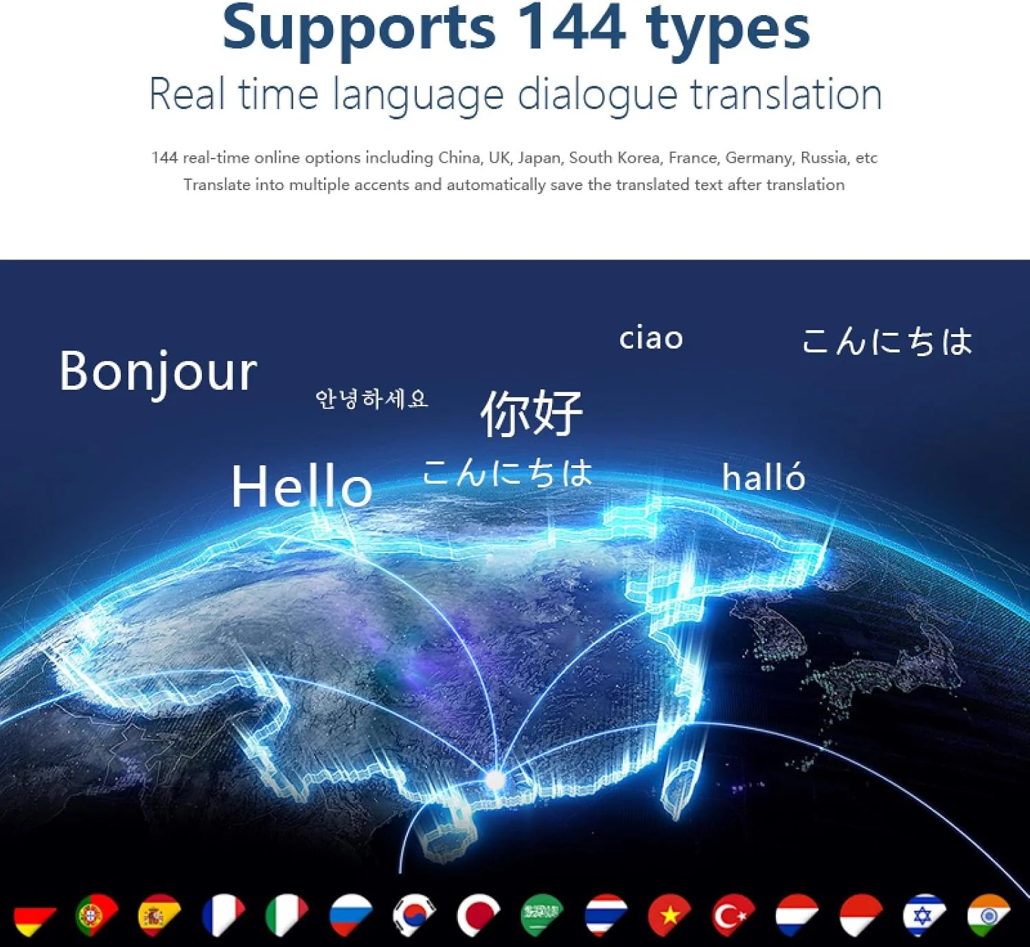 Achieving barrier free communication,The translation accuracy of minority languages reaches over 98%, supporting 144 languages,Business trips, travel, study abroad, communication barrier free, no need to worry about going to a strange place, intimate companionship, increase your confidence