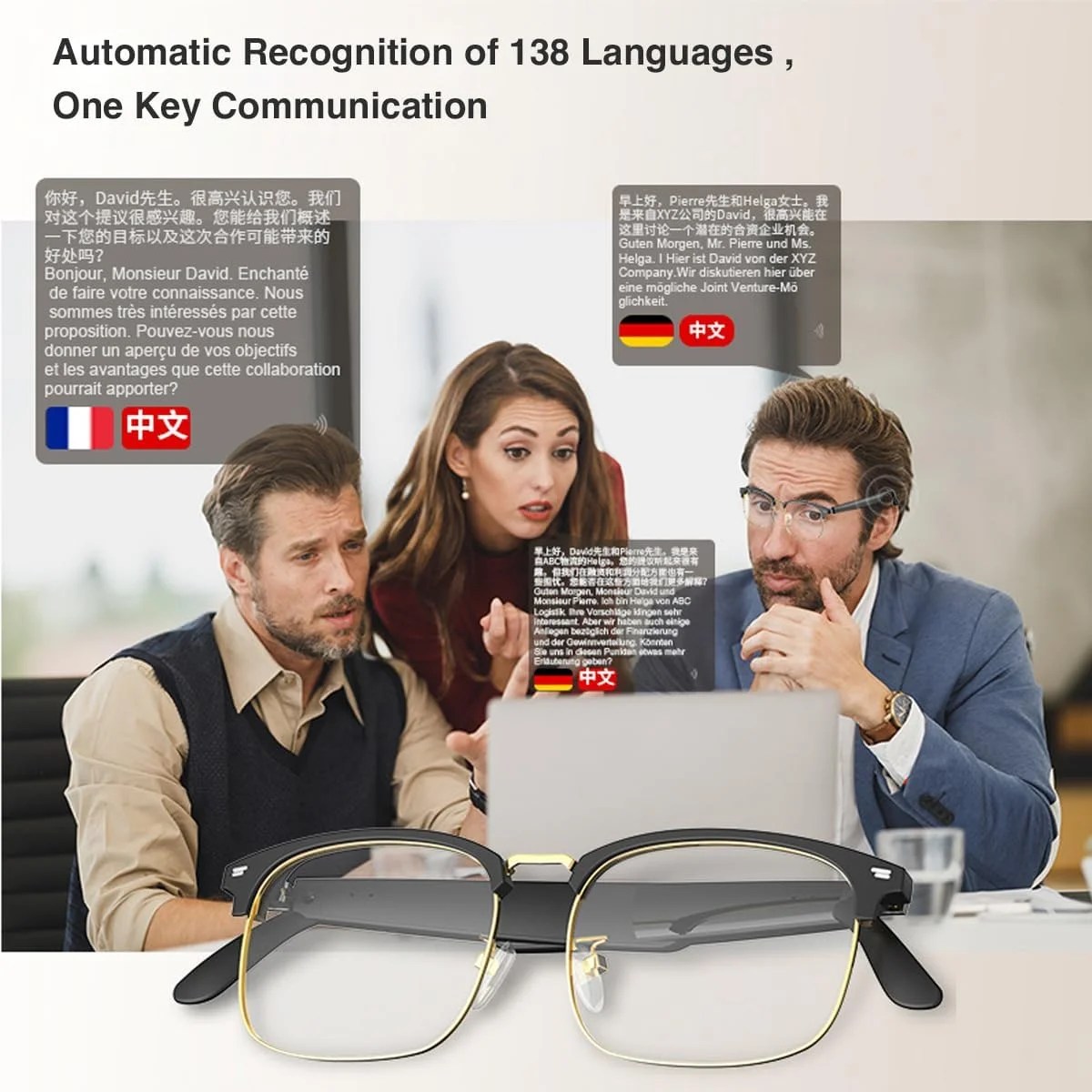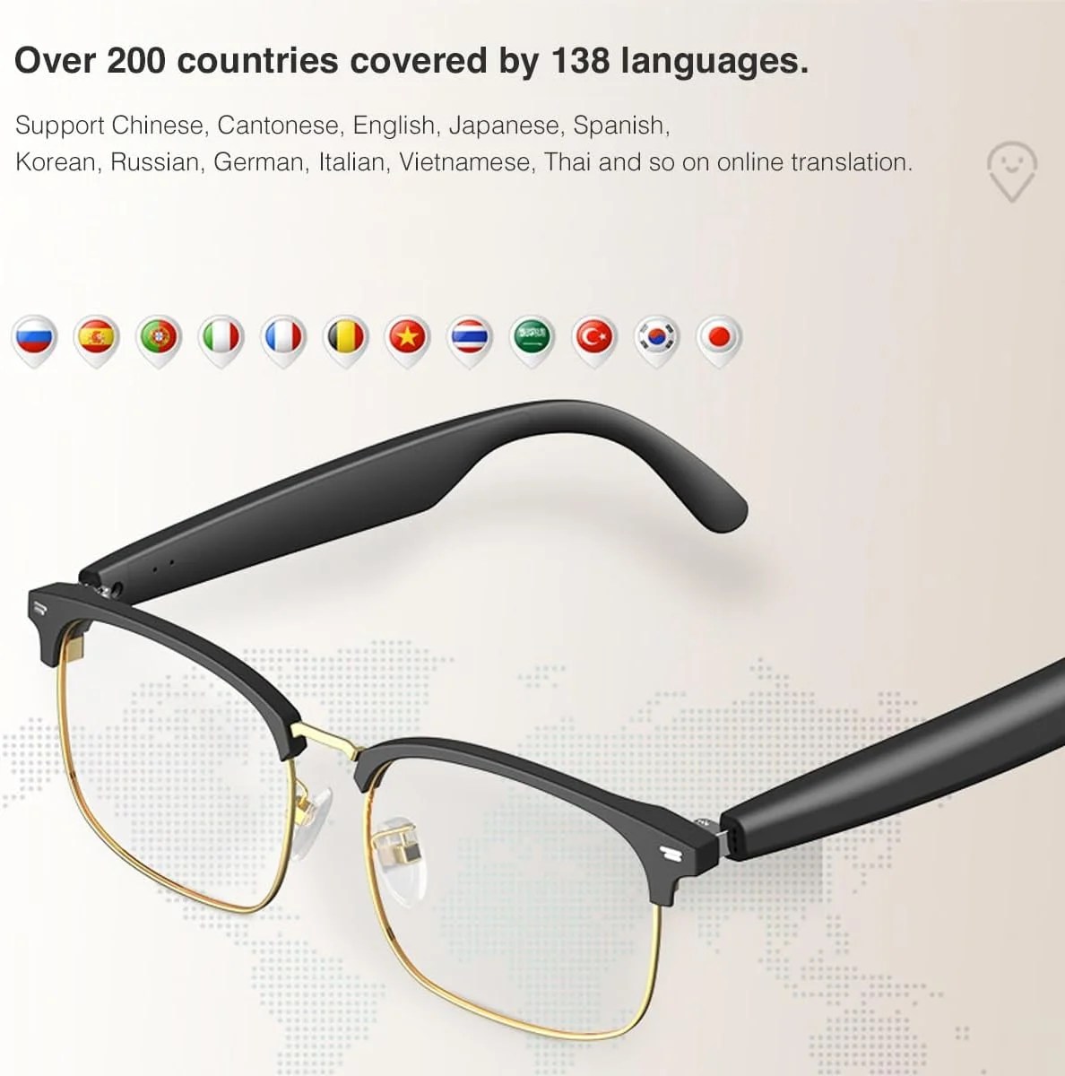 Intelligent Translator Glasses,support for 138 languages Face-free: No face shape, fat or thin can be used,Safe to use Lntelligent voice: Al intelligent voice assistant, One-click navigation Listen To Music / Hands-Free Calling Lightweight: Give you a very light wearing sense Bluetooth 5.3: Bluetooth stable use without stalling Battery life 6h: Maximum free endurance, Uninterruptible power
