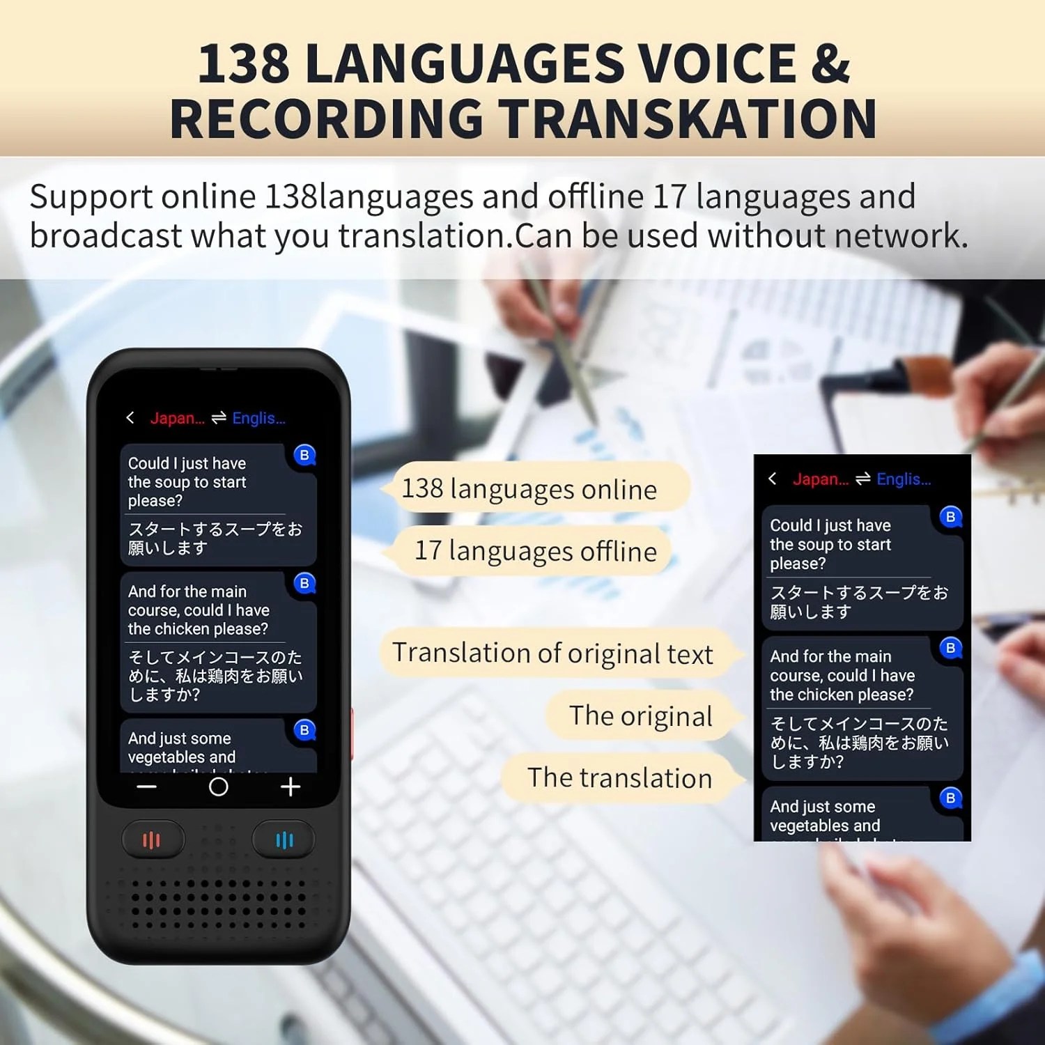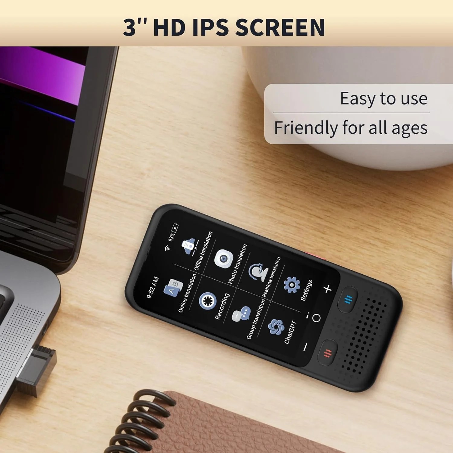 This portable translator is compact and lightweight, and can be easily carried in pockets and backpacks. The 3-inch high-definition touch screen allows you to easily read the translated text; the dual operation mode of touch buttons and physical buttons makes it easy for people of any age to use.