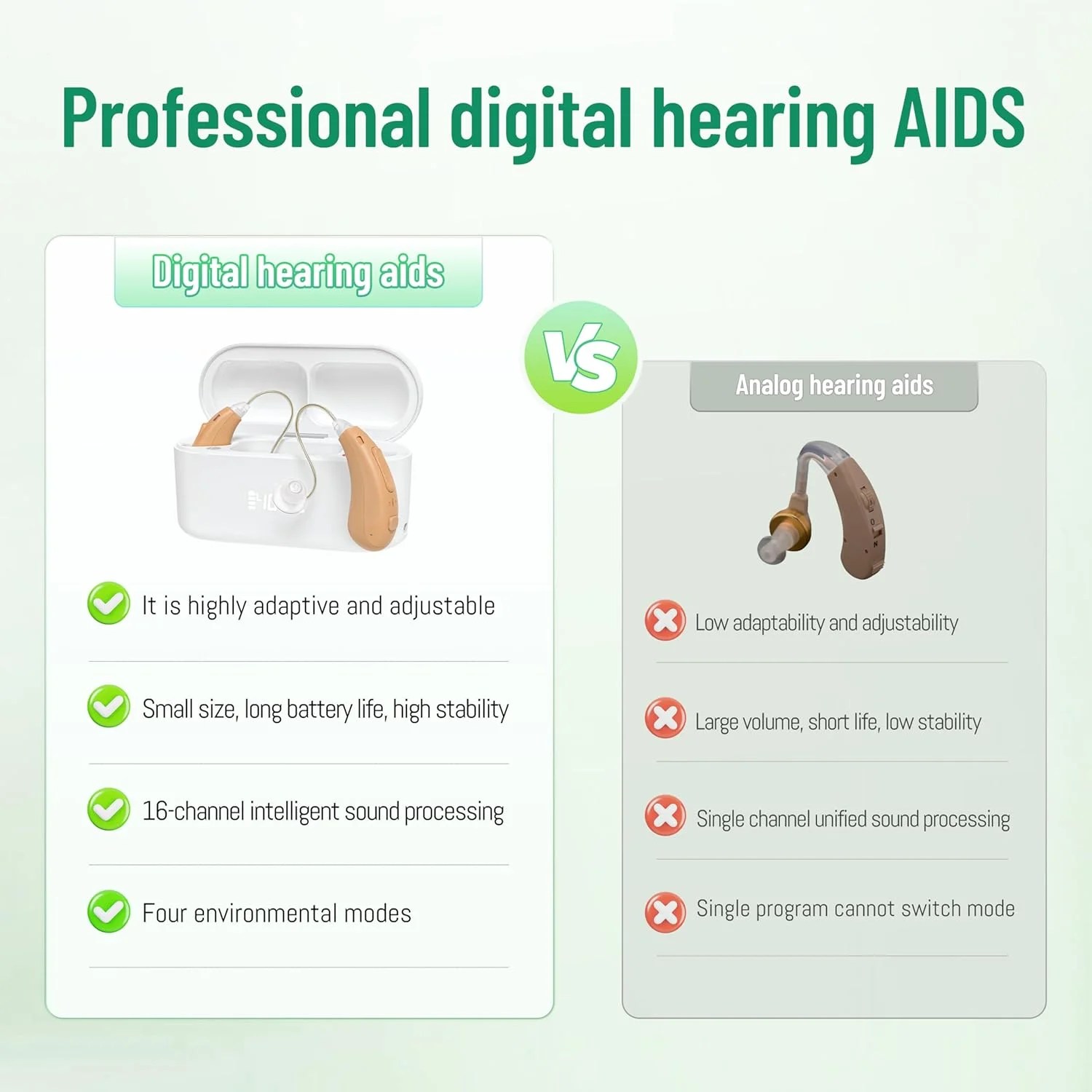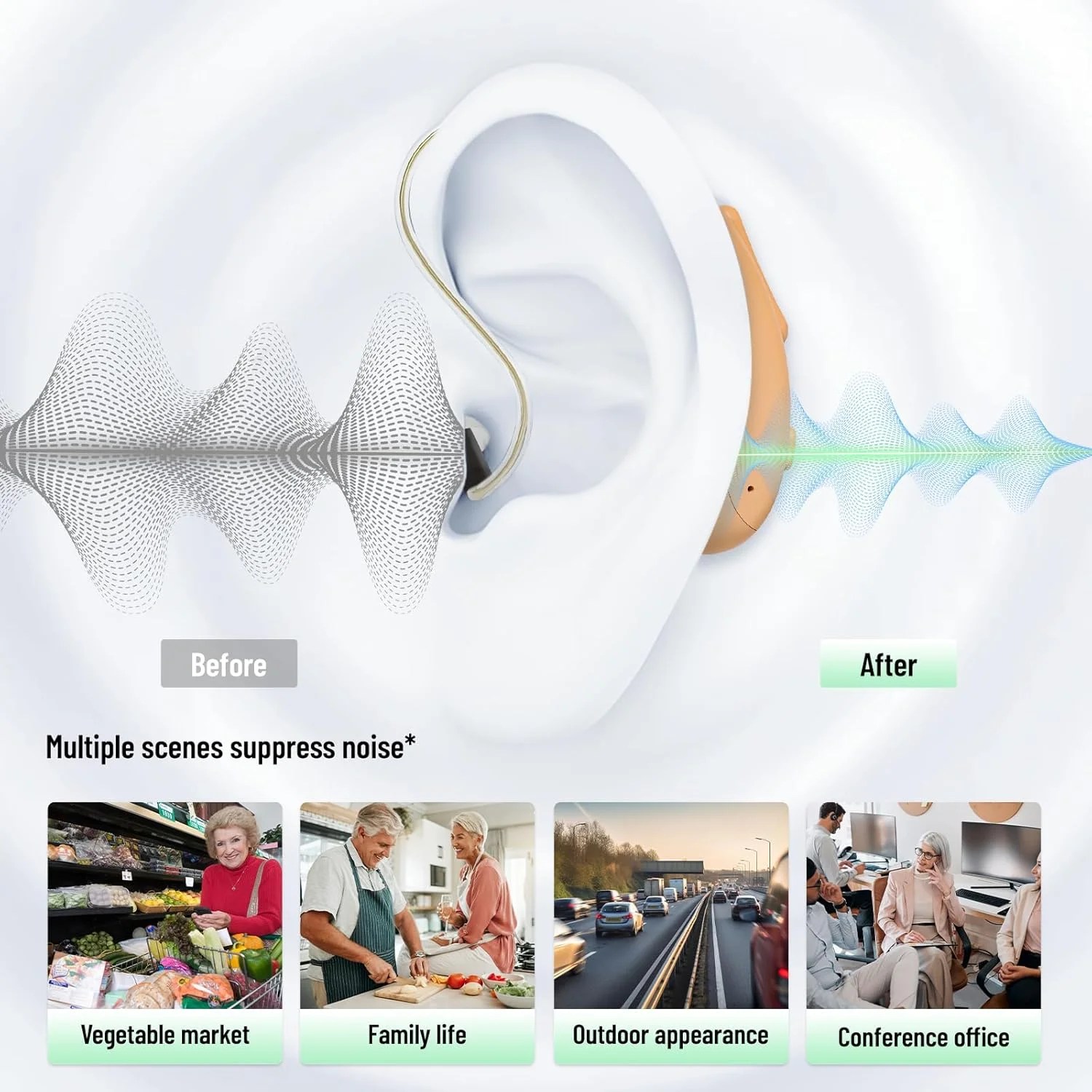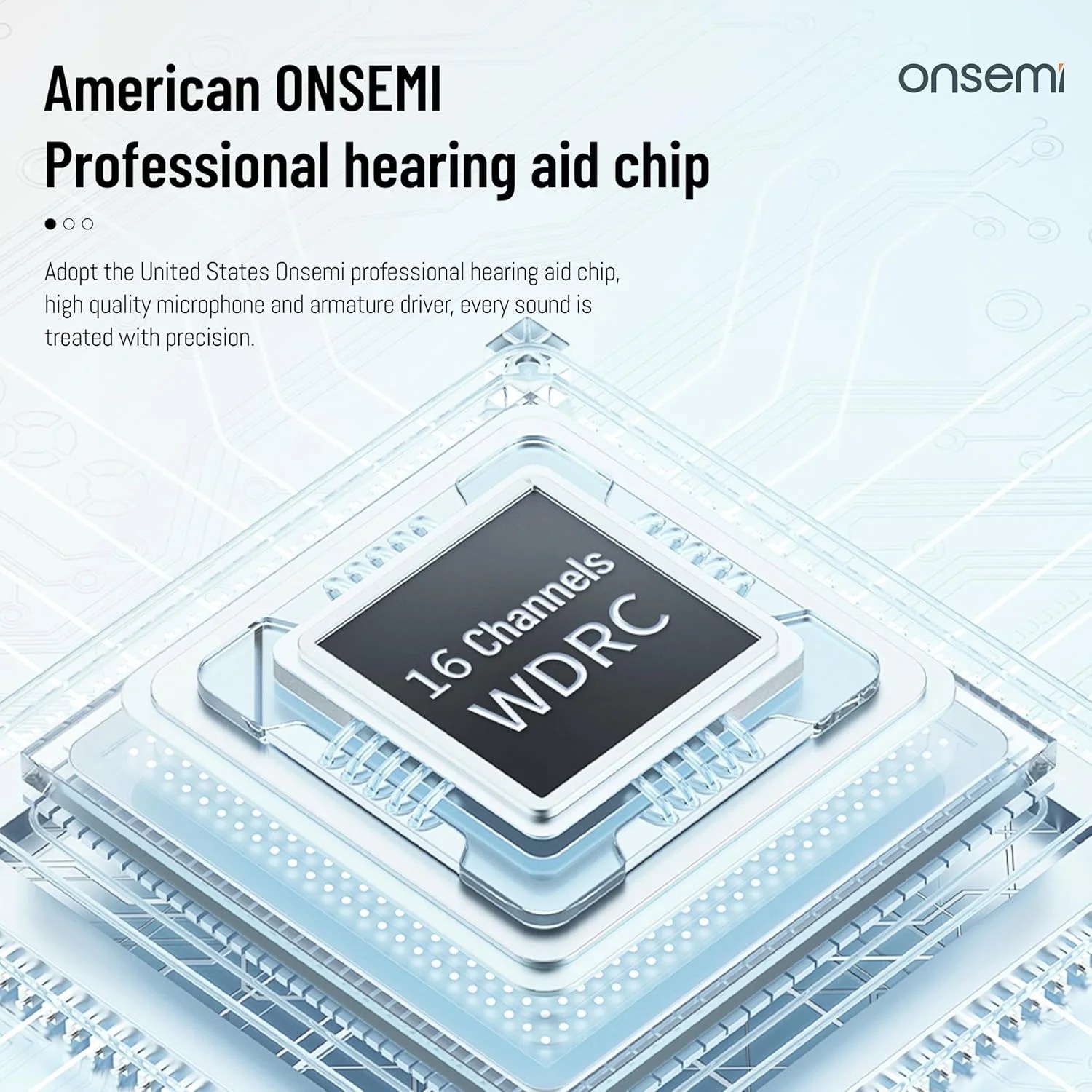 Our Rechargeable Hearing Aids for Seniors cater to a hearing loss range of 0 to 90dB, making them ideal for individuals with mild to severe hearing impairments. Engineered with a US-made digital chip, these hearing aids boast 16-channel sound processing to ensure unparalleled sound quality. Featuring an Advanced Receiver-in-Canal (RIC) design, they are equipped with adaptive noise reduction technology that significantly reduces distortion, delivering sound that is both natural and crystal clear.