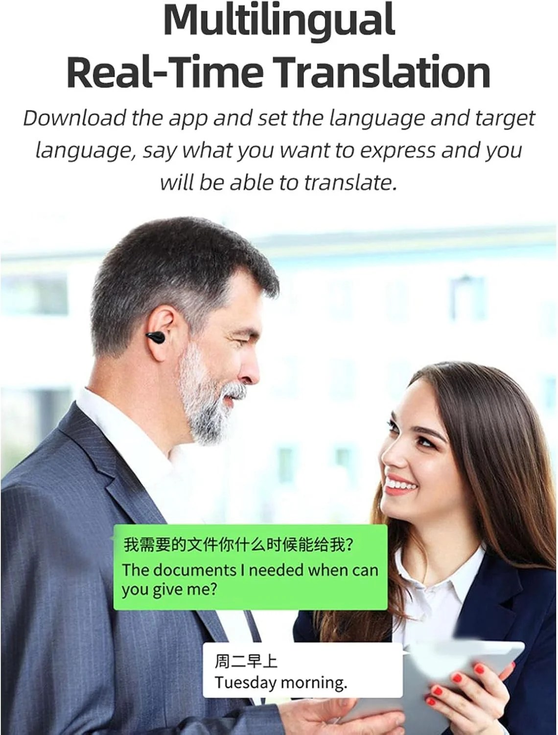 The translator earbuds support spoken translation, download the APP according to the operation manual, set up the language and target language you need to translate, and say what you want to say to be translated. Bluetooth 5.3 connection, intelligent noise cancellation.